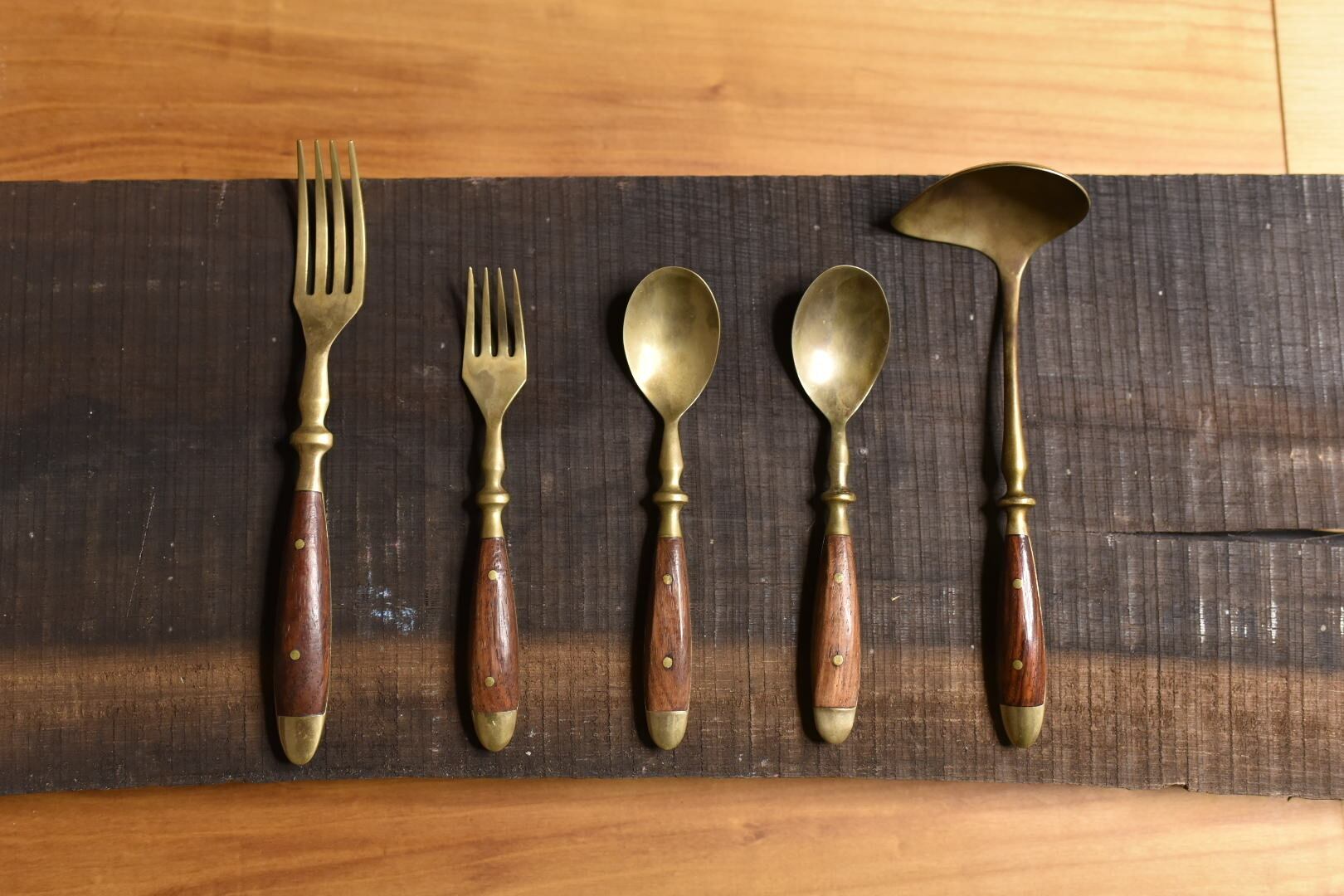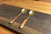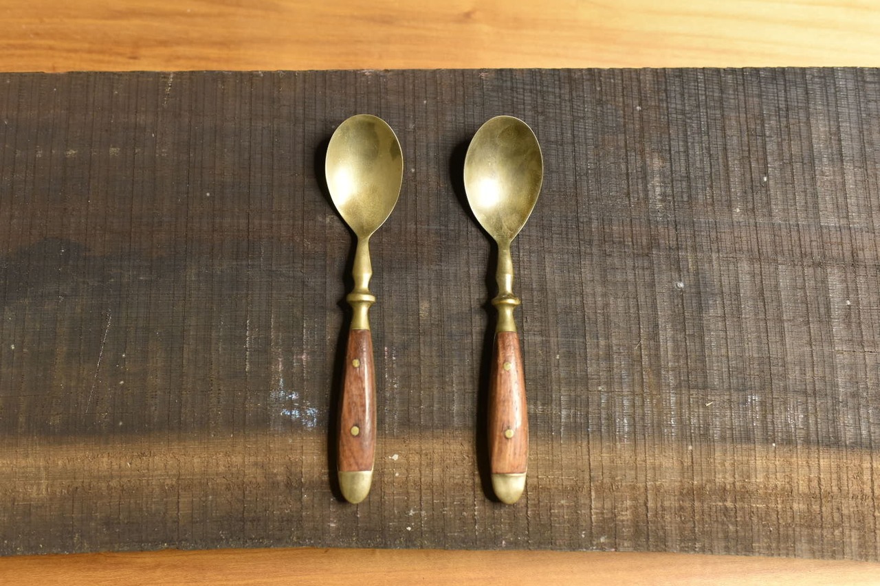 こちらはヴィンテージフリーマーケットで見つけた真鍮と持ち手がローズウッドの高級感あるスプーン2本セットです。ローズウッドは以前その美しさから全世界で人気があり伐採または、輸入、輸出、が禁止された木材。