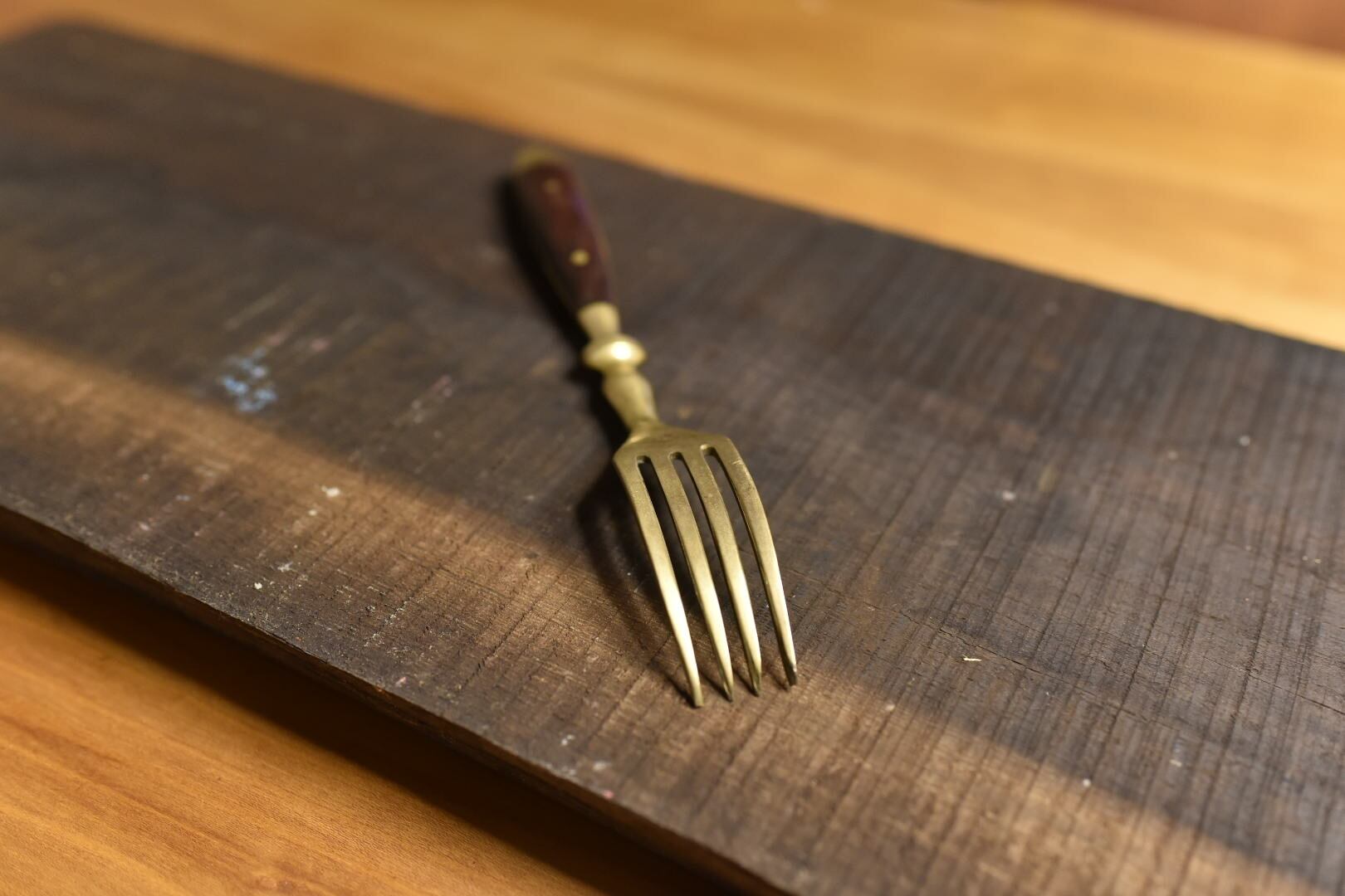 こちらはヴィンテージフリーマーケットで見つけた真鍮と持ち手がローズウッドの高級感あるフォークです。ローズウッドは以前その美しさから全世界で人気があり伐採または、輸入、輸出、が禁止された木材。